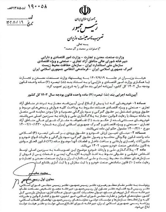 ‘هیئت وزیران در جلسه ۱۹ آذر امسال به پیشنهاد وزارت صنعت، معدن و تجارت با همکاری وزارت امور اقتصادی و دارایی و به استناد بند (ث) تبصره (۷) ماده واحده قانون بودجه سال ۱۴۰۲ کل کشور آییننامه اجرایی بند مذکور را به شرح زیر تصویب کرد: