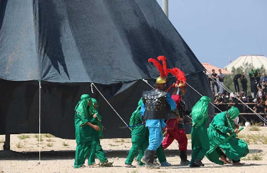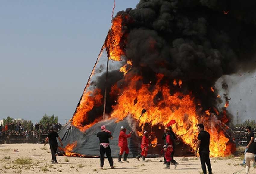 آیین سنتی خیمه سوزان عاشورای حسینی همزمان با آغاز ماه محرم و سوگواری شهادت حضرت امام حسین (ع) و یاران باوفای ایشان در جزیره کیش برگزار می شود. این مراسم از با قدمتی ۲۰ ساله،از مهمترین آداب و رسوم کیش میباشد که هرساله با استقبال انبوه مسافران عزادار از سراسر کشور همراه است. در این مراسم مردم شهر کیش، معمولاً خیمه های چهار گوش، گنبدی و مخروطی را تا عصر روز عاشورابرپامی کنند. حرکت نمادین کاروان امام حسین (ع)، کاروان اسیران کربلا، قربانی کردن، اقامه نماز ظهر عاشورا، تشییع نمادین پیکر شهدای کربلا، سوزاندن خیمه ها ، مراسم شام غریبان، برپا کردن دوباره خیمه ای سیاه رنگ با نام خیمه حضرت زینب (س) و روشن کردن شمع در کنار این خیمه، از مراسم دهه محرم در کیش است.