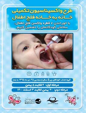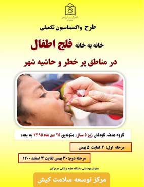 اجرای مرحله اول واکسیناسیون فلج اطفال در کیش : به گفته رییس مرکز توسعه سلامت کیش، مرحله اول برنامه ایمن سازی تکمیلی فلج اطفال در این جزیره از ۲۵ دی آغاز می شود.