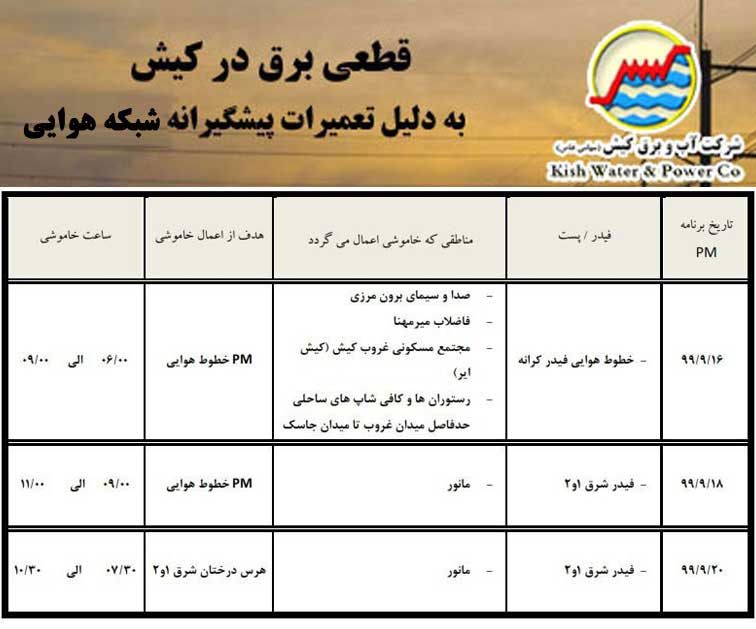 اطلاعیه قطعی برق در کیش از ۱۶ تا ۲۰ آذر ۱۳۹۹