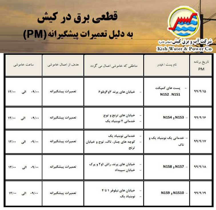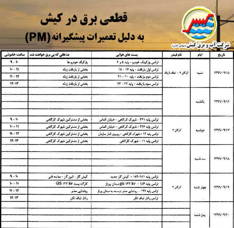 اطلاعیه قطعی برق در کیش از ۱۶ تا ۲۰ آذر ۱۳۹۹ : براساس اطلاعیهای از سوی شرکت آب و برق کیش، جهت انجام عملیات تعمیرات پیشگیرانه شبکه توزیع برق (هوایی و زمینی) از تاریخ ۹۹/۹/۱۶ الی ۹۹/۹/۲۰ و در ساعت های مشخص شده در مناطق ثبت شده در جدول های زیر خاموشی اعمال خواهد گردید.
