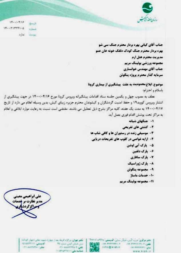 سخنگوی شورای سلامت کیش افزود: مقرر شد اماکن و مراکز تفریحی و گردشگری شامل جنگهای شبانه، کشتیهای تفریحی، غواصی در کلوپهای تفریحات دریایی، سافاری، گیم نتها، بولینگ، پارک دلفین ها، تم پارک کیش، پارک آبی، تفریحات مجموعه پنگوئن، پارکهای کودک، مراکز ماساژ تا ۲۴ تیر تعطیل شود.