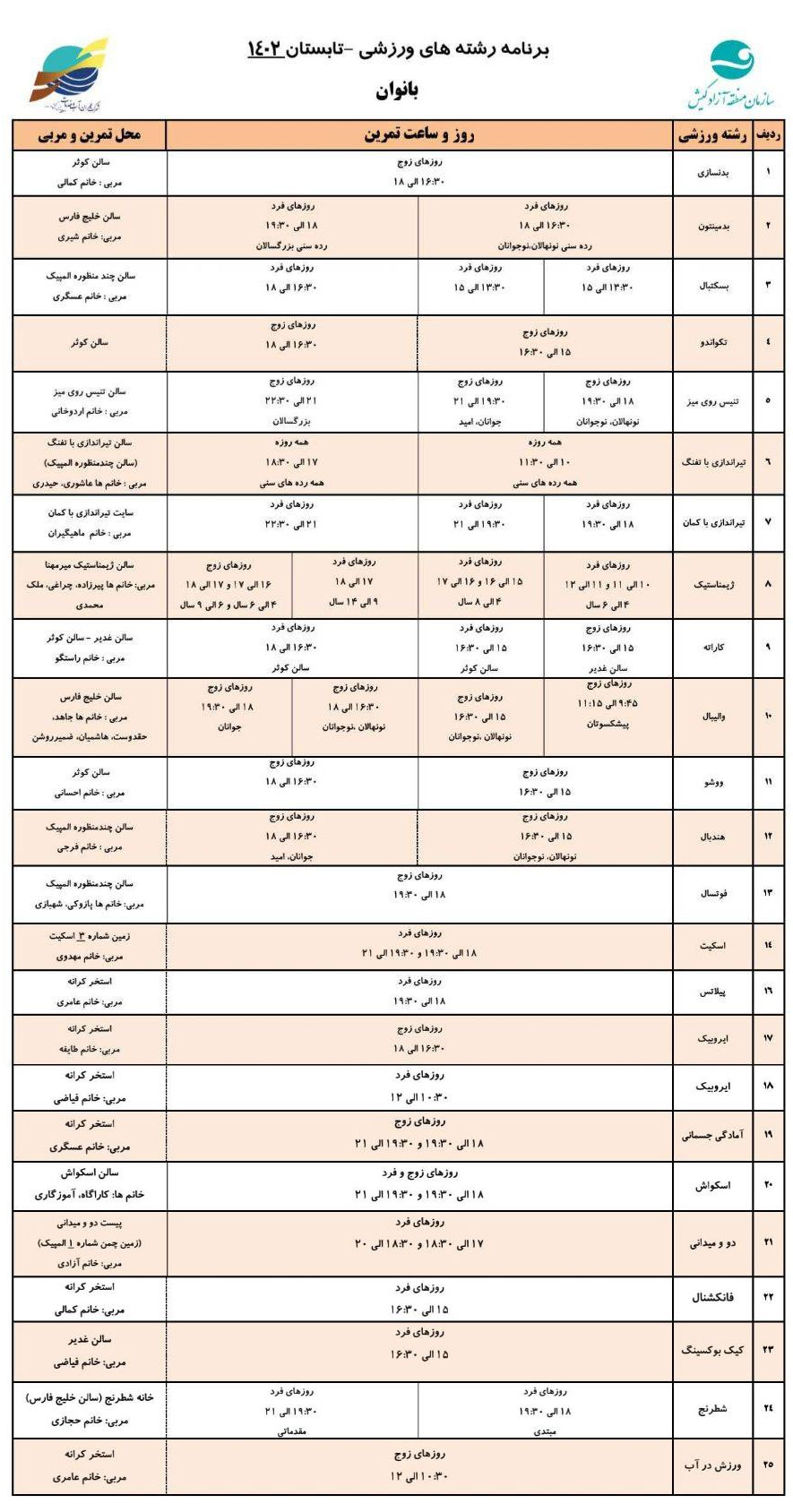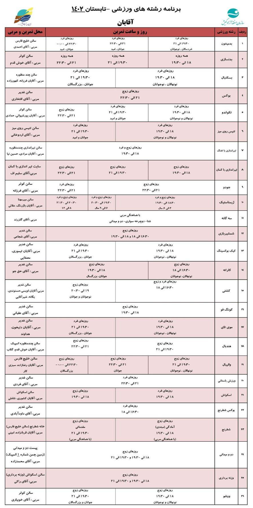 برنامه رشته های ورزشی ویژه تابستان ۱۴۰۲ در کیش به شرح جدول های زیر اعلام شده است.
