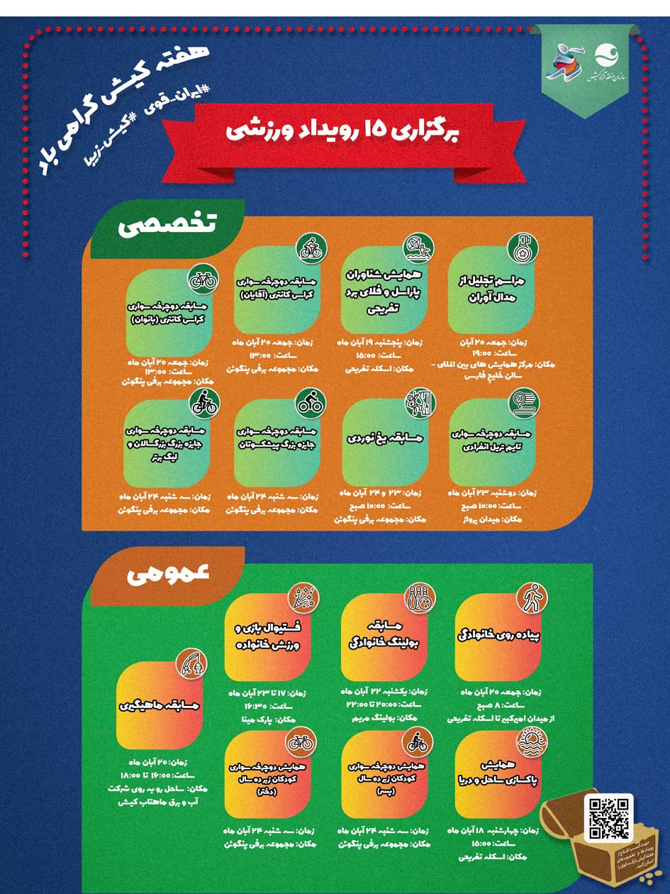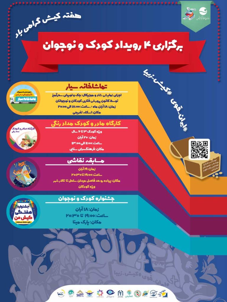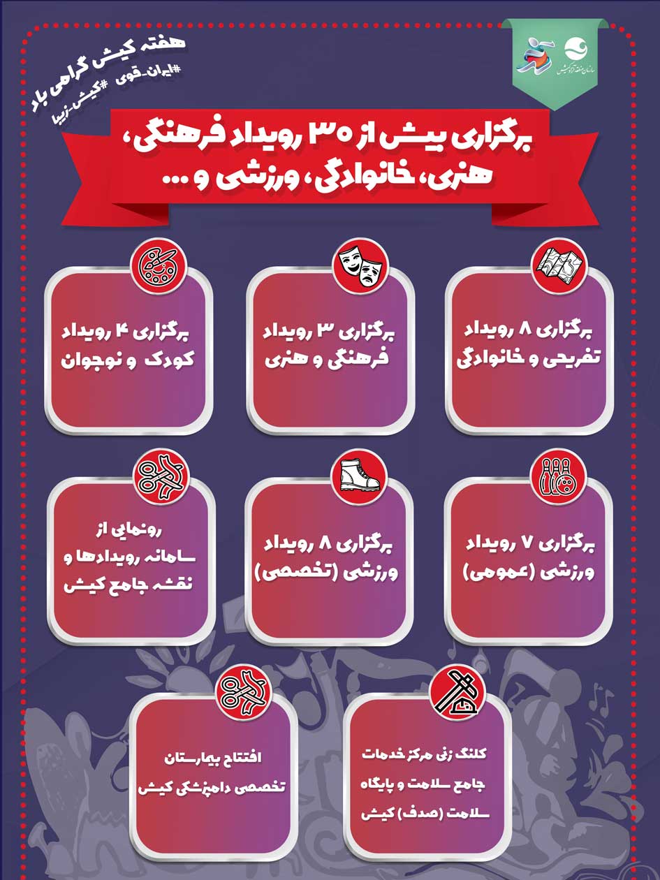 برنامه زمانبندی رویدادهای هفته کیش :: کد خبر : 30601 :: نویسنده: مدیر سایت :: تاریخ انتشار : ۱۴۰۱/۰۸/۱۷ برگزاری هفته کیش با ۳۰ رویداد شامل ۱۵ برنامه ورزشی، ۹ برنامه تفریحی و ۶ برنامه فرهنگی و هنری برنامهریزی شده است.