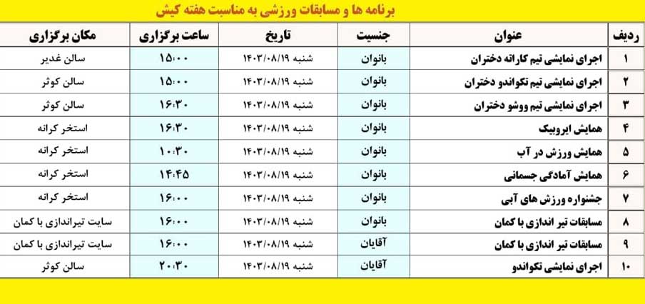 برنامه مسابقات ورزشی به مناسبت روز کیش ۱۴۰۳ : همزمان با گرامیداشت ۲۰ آبان، روز کیش، برنامه ها و مسابقات ورزشی ویژه آقایان و بانوان روز شنبه ۱۹ آبان ماه ۱۴۰۳ به شرح جدول زیر برگزار می شود.