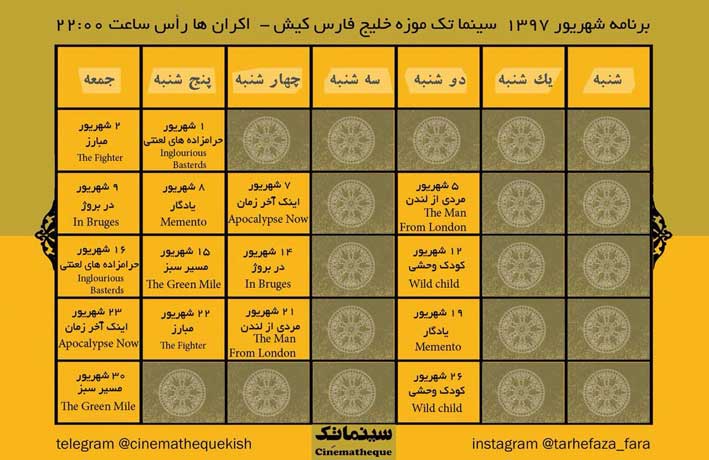 برنامه نمایش فیلمهای سینماتک کیش در شهریور ۱۳۹۷ :: کد خبر : 7066 :: نویسنده: مدیر سایت :: تاریخ انتشار : ۱۳۹۷/۰۶/۰۱ برنامه نمایش فیلمهای سینماتک کیش در شهریور ۱۳۹۷ جدول هفتگی اکران های سینماتِک در شهریور