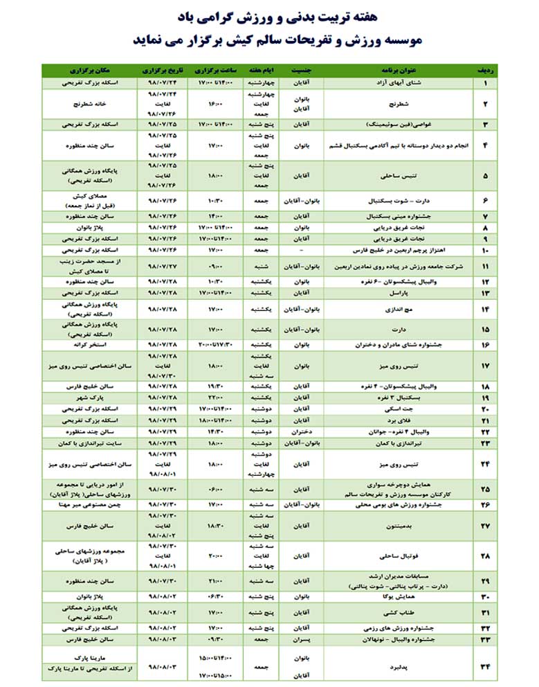 به مناسبت گرامیداشت هفته تربیت بدنی و ورزش در راستای تندرستی و نشاط و شادابی جامعه و کیشوندان مسابقات و جشنواره های ورزشی از سوی موسسه ورزش و تفریحات سالم کیش با همکاری هیأت های ورزشی برگزار خواهد شد.