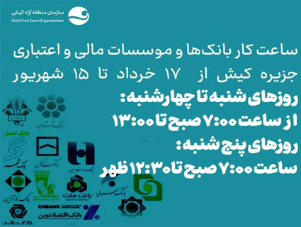 همچنین با توجه به لزوم کاهش مصرف برق، ساعت کار بانکها و موسسات مالی و اعتباری جزیره کیش از پنجشنبه ۱۷ خرداد تا ۱۵ شهریور ۱۴۰۳، روزهای شنبه تا چهارشنبه از ساعت ۷ صبح تا ۱۳:۰۰ و روزهای پنج شنبه نیز از ساعت ۷ صبح تا ۱۲:۳۰ ظهر آماده ارائه خدمات به مشتریان هستند.