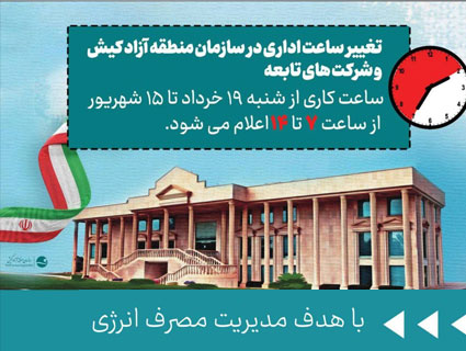 با توجه به مصوبه هیات وزیران در بیست و هشتم اسفند ۱۴۰۱، ساعت کاری سازمان منطقه آزاد کیش و شرکت های تابعه با هدف مدیریت مصرف انرژی از شنبه ۱۹ خرداد تا ۱۵ شهریور ۱۴۰۳، از ساعت ۷ صبح تا ۱۴ اعلام شد.