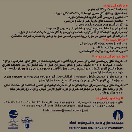 آدرس کانال جهت اطلاعات بیشتر جهت ثبت نام در دوره های رزیدنسی (اقامت هنری) در کیش : kish.museum@