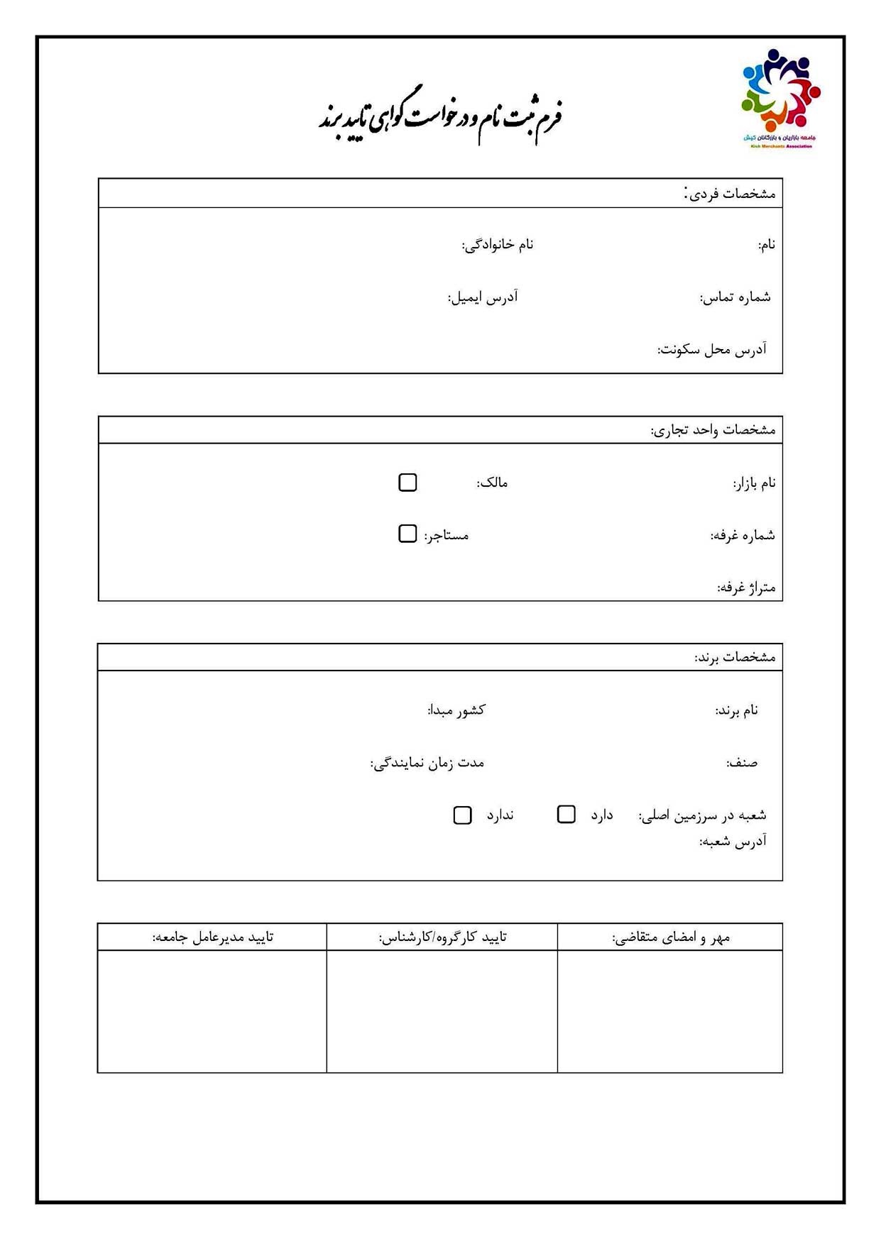 فرم ثبت نام و درخواست گواهی تأیید برند در جزیره کیش :