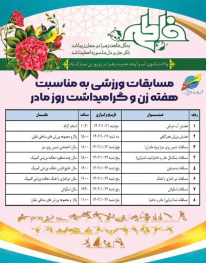 مسابقات ورزشی در کیش به مناسبت روز مادر : معاونت ورزش و تفریحات سالم با همكاری هيات های ورزشی کیش، به مناسبت گرامیداشت ولادت حضرت فاطمه (س) و بزرگداشت روز مادر مجموعه مسابقات ورزشی را طبق جدول زیر برگزار می نماید.