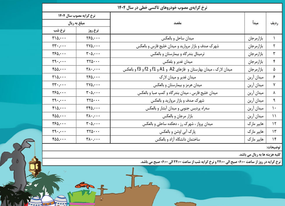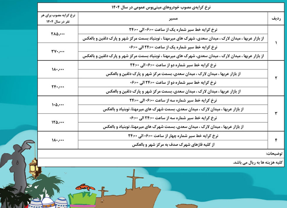 نرخ جدید حمل و نقل عمومی کیش در سال ۱۴۰۴