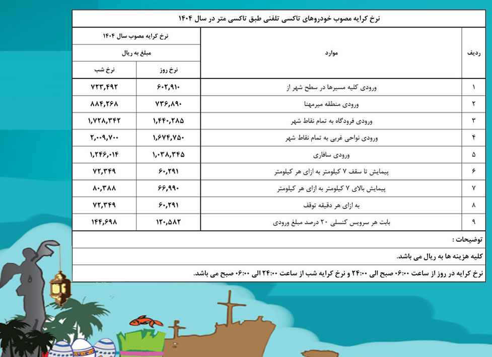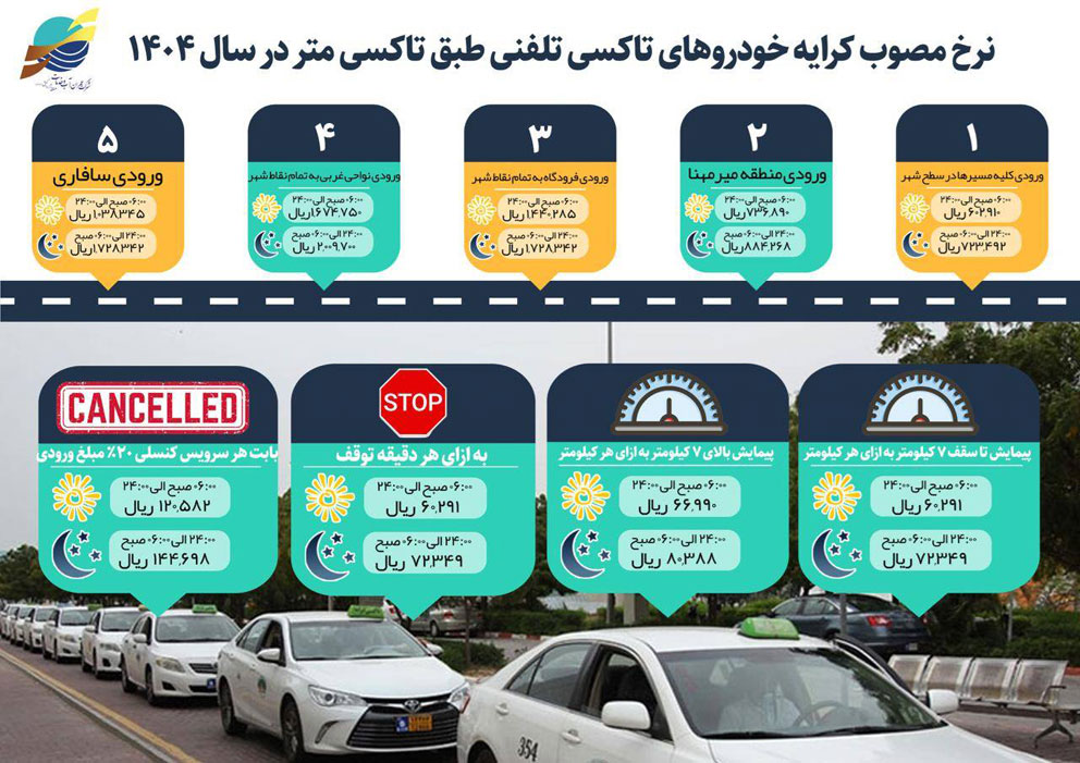 براساس نتایج صد و هفتاد و هشتمین جلسه شورای ترافیک، نرخ کرایه تاکسی و مینی بوس عمومی و خصوصی سال ۱۴۰۴ ابلاغ شد.
