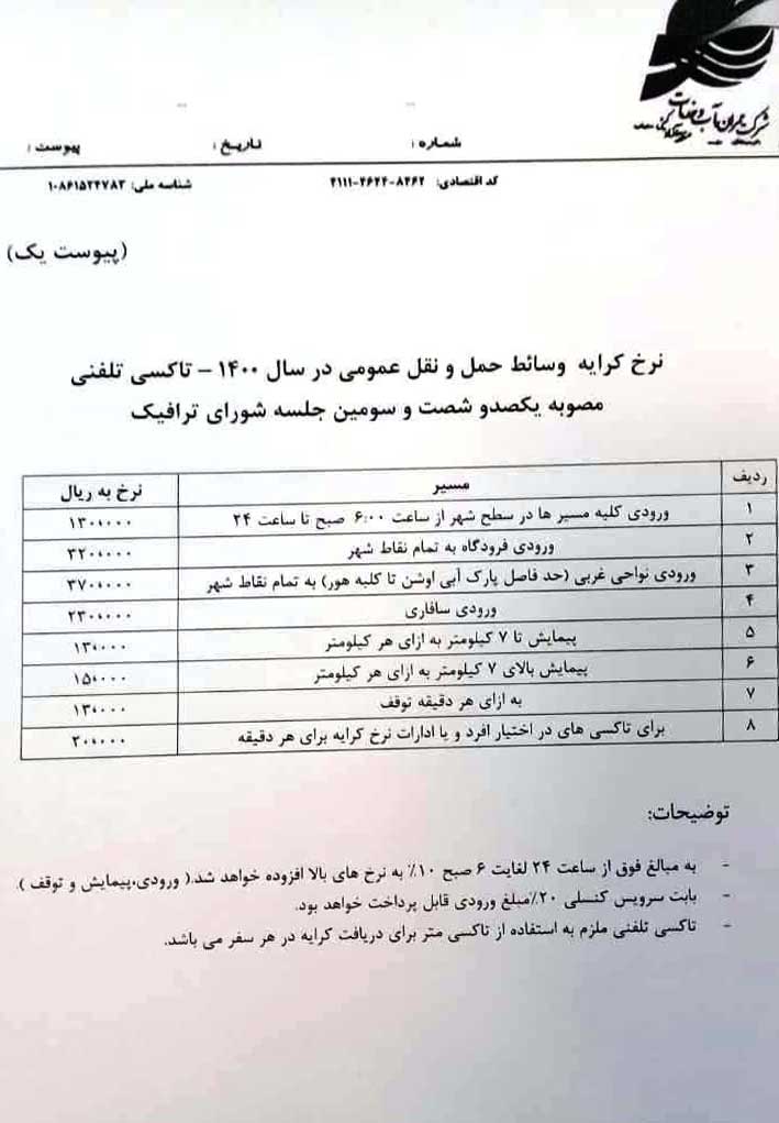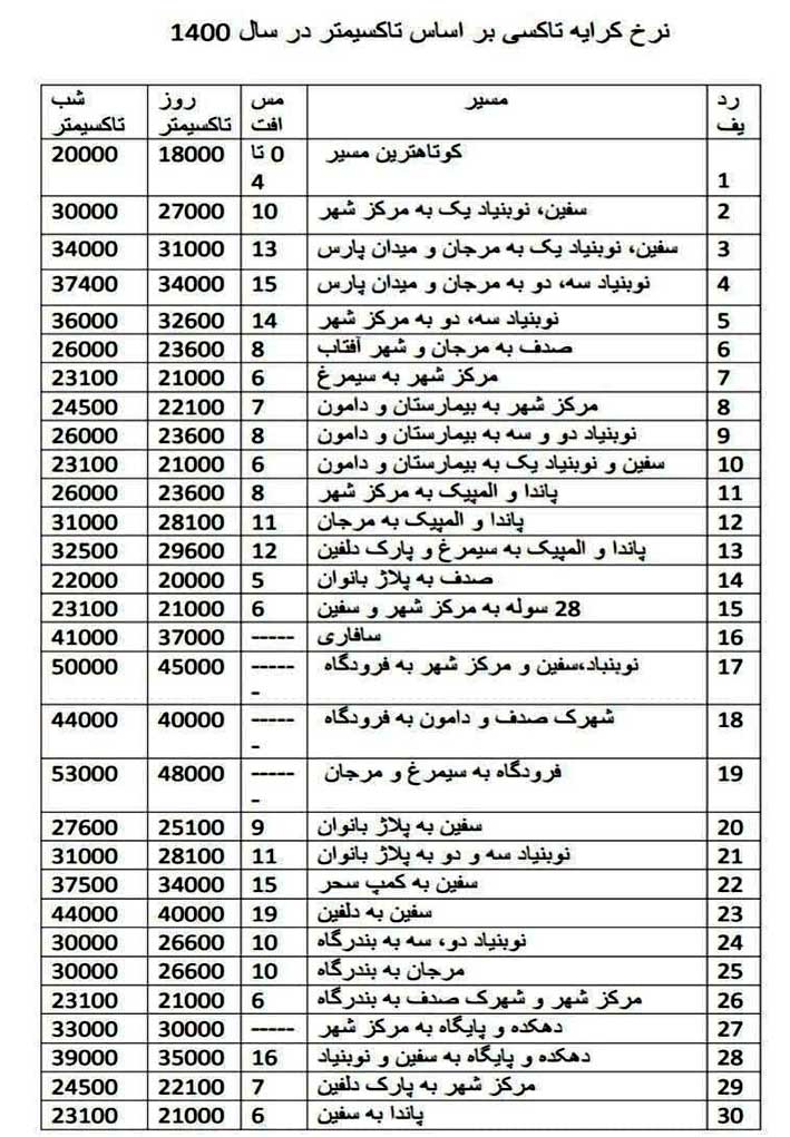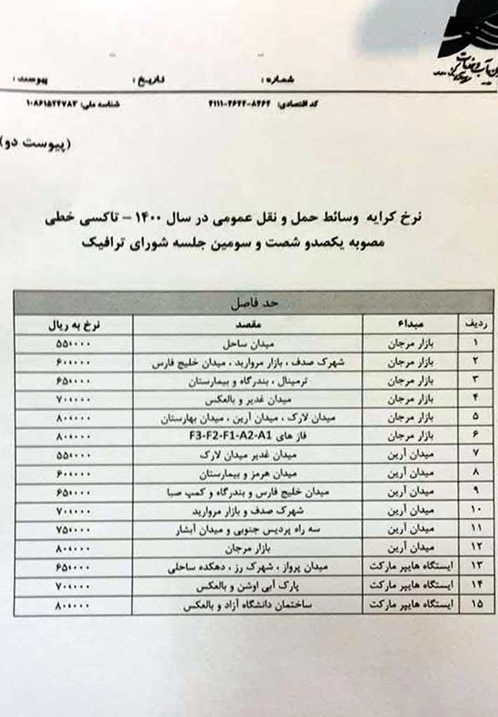 از مبداء میدان آرین نیز به مقاصد: میدان غدیر و لارک، میدان هرمز و بیمارستان، میدان خلیج فارس و بندرگاه و کمپ صبا، شهرک صدف و بازارمروارید، سهراه پردیس و میدان آبشار و بازار مرجان، بهترتیب: نرخهای ۵۵.۰۰۰، ۶۰.۰۰۰، ۶۵.۰۰۰، ۷۰.۰۰۰، ۷۵.۰۰۰، ۸۰.۰۰۰ ریال تصویب شد.