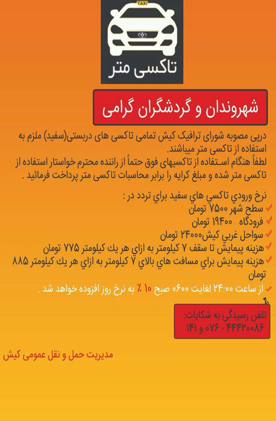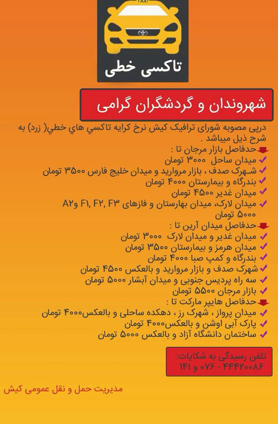 نرخ نامه جدید حمل و نقل عمومی در کیش ، کرایه تاکسی کیش