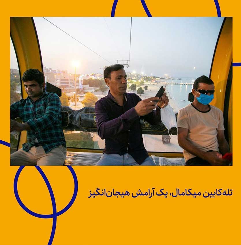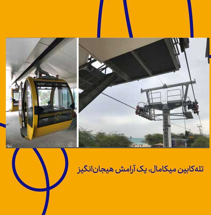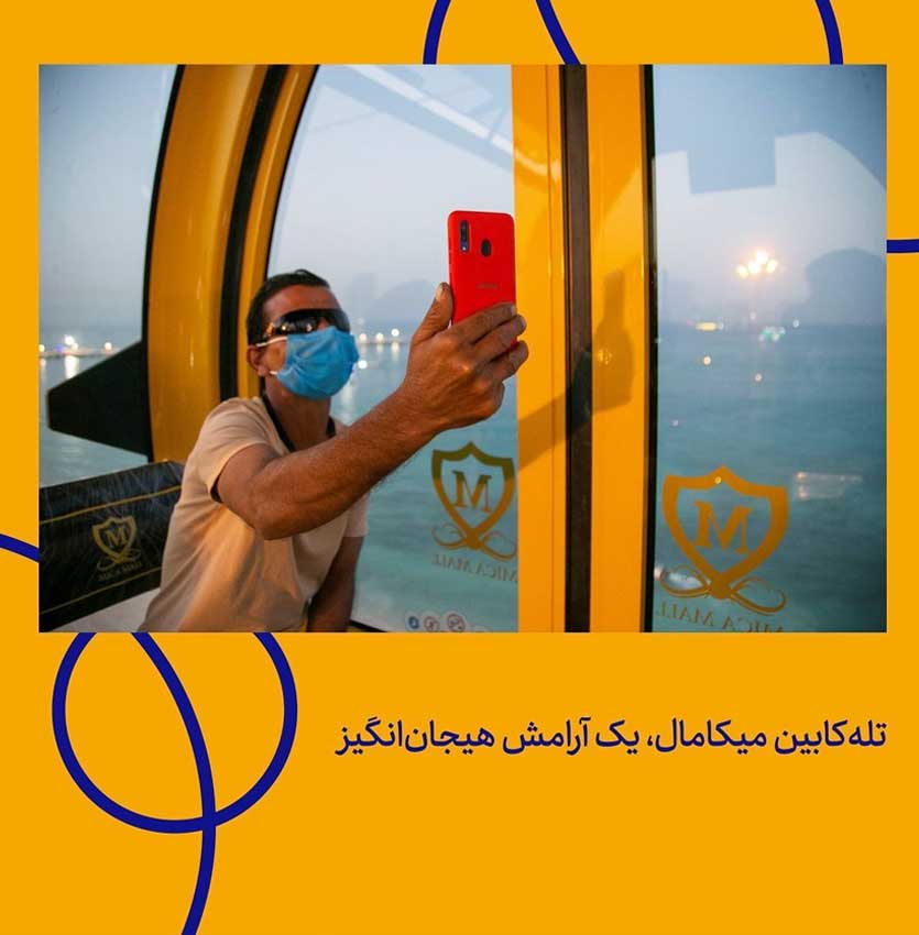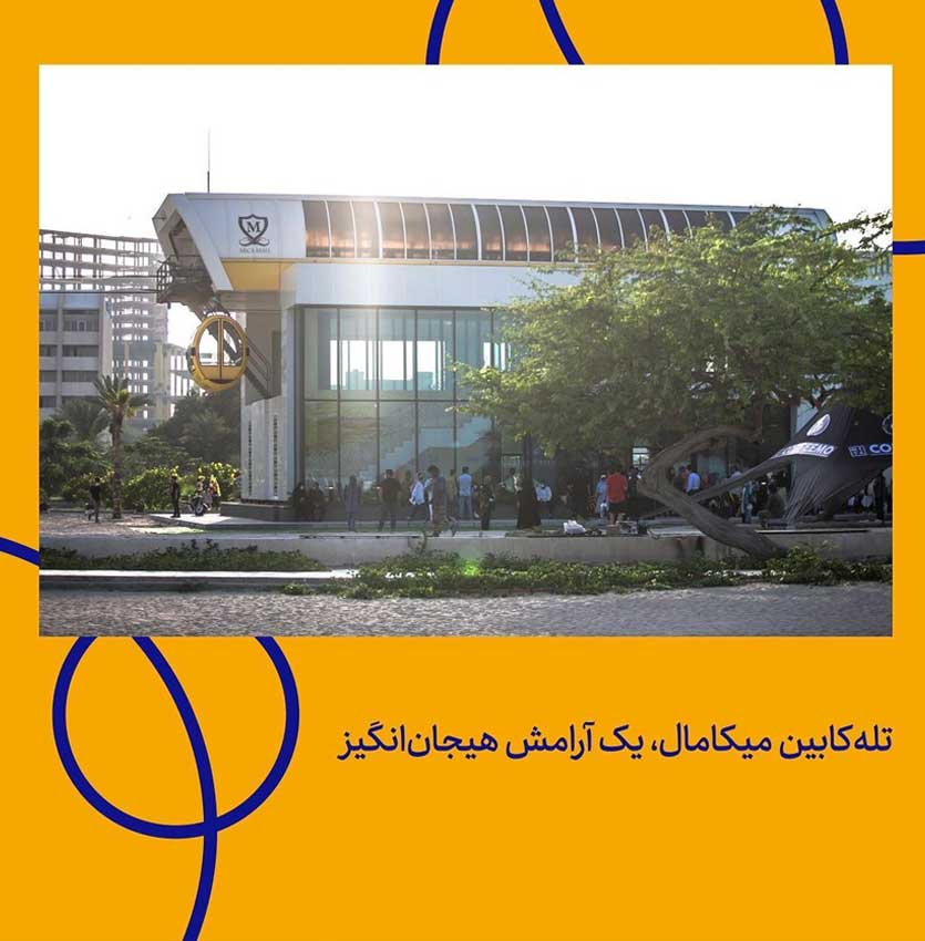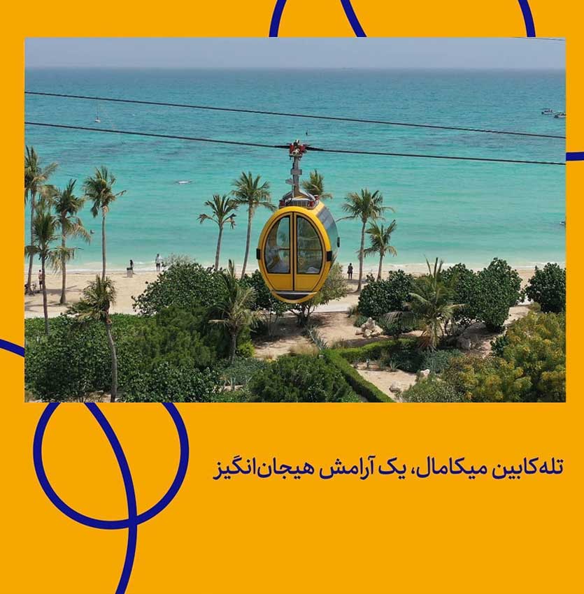 با تله کابین کیش سفری دو و نیم کیلومتری بر فراز جزیره زیبای کیش و آب های نیلگون خلیج فارس از بام میکامال کیش (طبقه چهارم) تا اسکله بزرگ تفریحی کیش و برعکس را تجربه کنید. برای فراهم کردن اوقات لذت بخش، تمام کابین ها به سیستم خنک کننده، LCD، Wi-Fi و موزیک مجهز شده است.